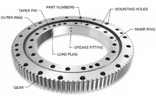 内圈和外圈 回转支承由两个环组成,每个环包含一个精密滚道,该滚道在表面上进行感应淬火至指定深度。每个环由中碳钢锻件制成。GUFEAL和单排球系列回转支承的滚道采用四点接触配置,标准接触角为45°。还可以使用其他滚道配置,例如交叉滚子和八点接触。在需要非常高的负载或特殊刚度要求的情况下,通常会考虑使用这些其他选项。 滚动元素 精密滚动元件(用于GUFEAL和轻型系列回转支承的特殊淬硬铬合金钢球)有助于内圈和外圈之间的相对转动。也经常使用辊子作为滚动元件。 垫片,垫片球和分隔器 通常用塑料制成的垫片通常用于分隔滚珠,以防止其直接相互摩擦。有时使用隔离球代替隔离球。在这种情况下,这些球比放置在每个承载球之间的承载球略小。有时,应用程序参数需要使用分隔符。 安装孔 安装孔通常沿着内圈和外圈的表面沿均匀的螺栓圈和相等的间距隔开。这些孔可以是通孔,螺纹孔,盲孔,沉头孔等。有时需要定制螺栓的圆度或间距要求,以满足特定应用的需求,在这种情况下,可以使用定制选项。对于本目录中列出的标准零件号或GUFEAL提供的其他自定义版本,设备设计者,制造商或用户应负责确定安装设计是否适当。 封条 回转支承的每一侧都有密封件,其主要功能是保持油脂并防止某些污染物(例如灰尘和碎屑)进入回转支承。密封件通常由挤压的Buna-N橡胶条制成,较小的尺寸是金属非接触式屏蔽。 负荷塞 由于座圈硬化过程的性质,每个座圈的座圈硬度都有差距。在非齿轮环或非齿轮回转支承外环的位置上钻一个孔,以允许将球装入最终的回转支承组件中。用锥形销塞住并固定此孔。请注意,对于不带负荷塞的环,在环的表面上,在滚道中未硬化间隙的位置(也称为软点)上会刻有“ S”字样。卸下负载插头会使保修无效。 锥销 将负载塞固定在内圈或外圈上。 齿轮 回转支承回转支承可按原样提供,或在内圈ID或外圈OD上带齿轮。齿轮通常是带有反冲规定和AGMA Q8最低质量的标准渐开线渐开线正齿轮。可以在随附的尺寸表中找到每个回转支承的详细信息,并且可以从GUFEAL获得图纸。还提供定制齿轮配置。 油嘴 这些环之一中至少包含一个油脂配件。数量可能会随回转支承的直径而增加。对于带齿轮回转支承,润滑脂接头位于无齿圈的ID或OD上。对于非回转支承,GUFEAL系列回转支承都配备在内圈或外圈上可容纳油脂配件。提供润滑脂接头的定制数量,位置和配置。 零件号 零件号和序列号刻在回转支承的一个面上。